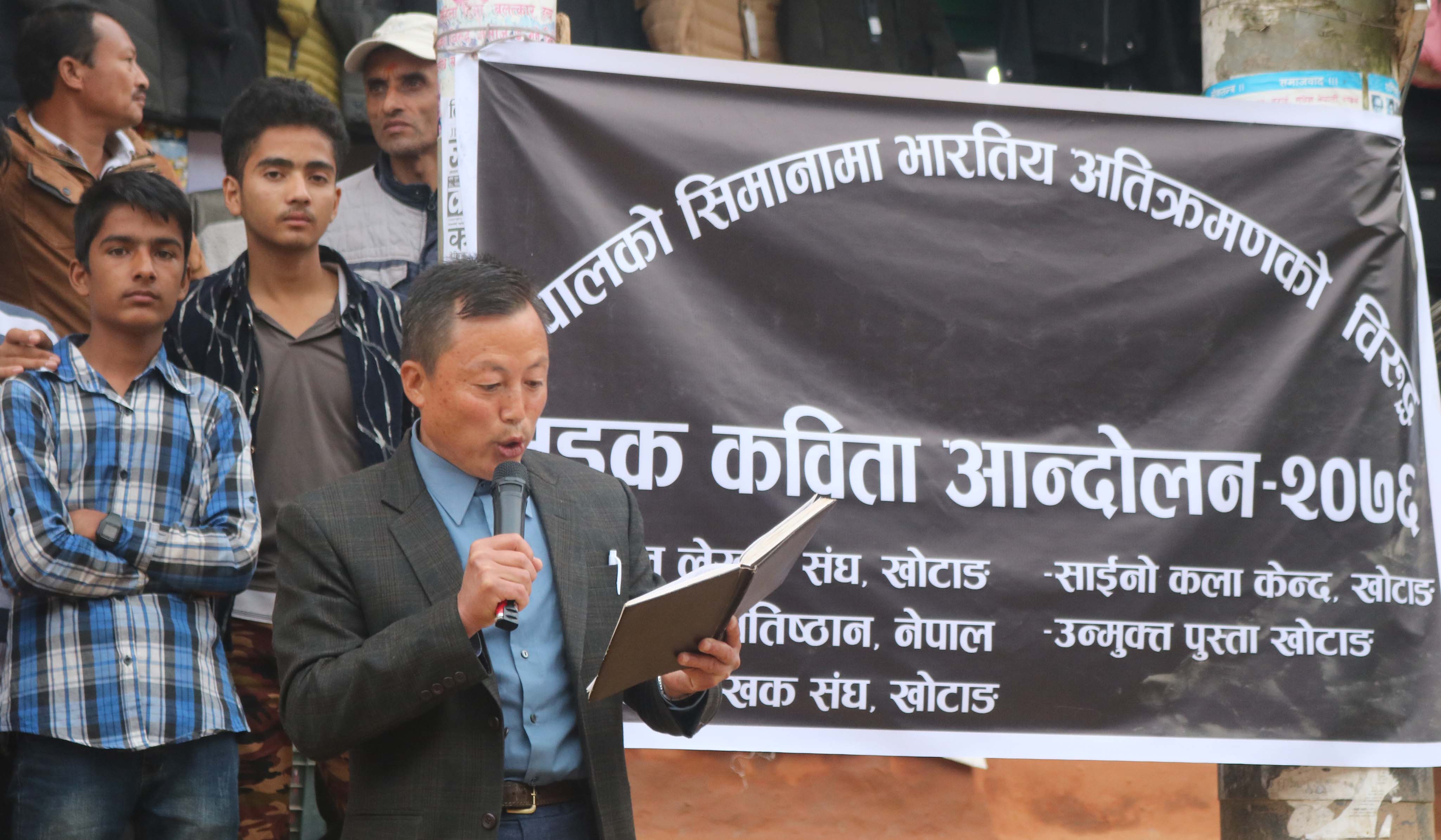खोटाङ, २३ कातिक । भारतले हालै जारी गरेको नयाँ राजनीतिक नक्सामा नेपाली भूमि कालापानी, लिपुलेक र लिम्पियाधुरा समेटिएको भन्दै त्यसको बिरोधमा शुक्रबार खोटाङमा साहित्यिक आन्दोलन गरिएको छ । प्रगतिशील लेखक सङ्घ, टेम्के तुवाचुङ प्रतिष्ठान नेपाल, किराँत राई लेखक सङ्घ, साईनो कला केन्द्र र उन्मुक्त पुस्ता खोटाङले दिक्तेलस्थित त्रिवेणीचौकमा साहित्यिक आन्दोलन गरेको हो ।