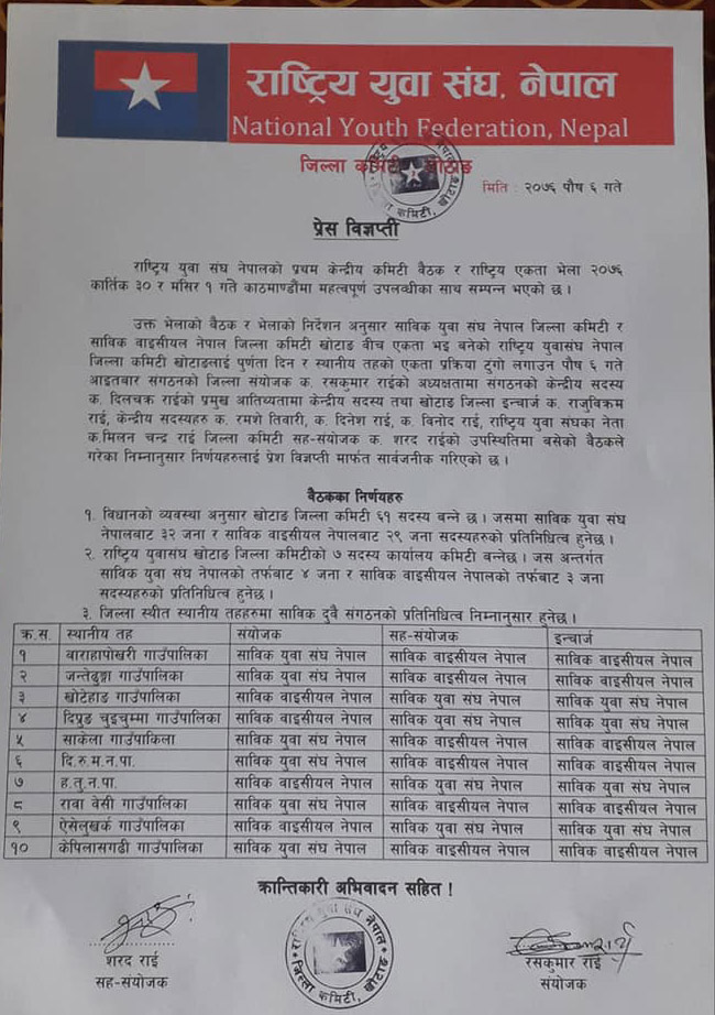 राष्ट्रिय युवा संघको कात्तिक ३० गते र मंसिर १ गते सम्पन्न बैठक र एकता भेलाले साविकको युवा संघलाई संयोजक र साविकको वाइसिएललाई सहसंयोजक दिने सहमती भए अनुशार जिल्लामा ६१ सदस्यीय राष्ट्रिय युवा संघ गठन गरिएको छ । बैठकले साविकको युवा संघबाट ४ जना र साविकको वाइसिएलबाट ३ जना रहने ७ सदस्यीय कार्यालय कमिटि बनाउने निर्णय गरेको छ ।
