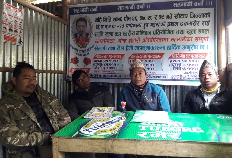 खोटाङ, २० पुस । युवा नेता ढकमसेर राईको स्मृतिमा विभिन्न प्रतियोगिता हुने भएको छ । प्रस्तावित ढकमसेर राई स्मृति प्रतिष्ठानले वडा स्तरिय खुला भलिवल , खुला डबल व्याडमिन्टन तथा लोकदोहोरी प्रतियोगिता संचालन गर्ने भएको हो ।