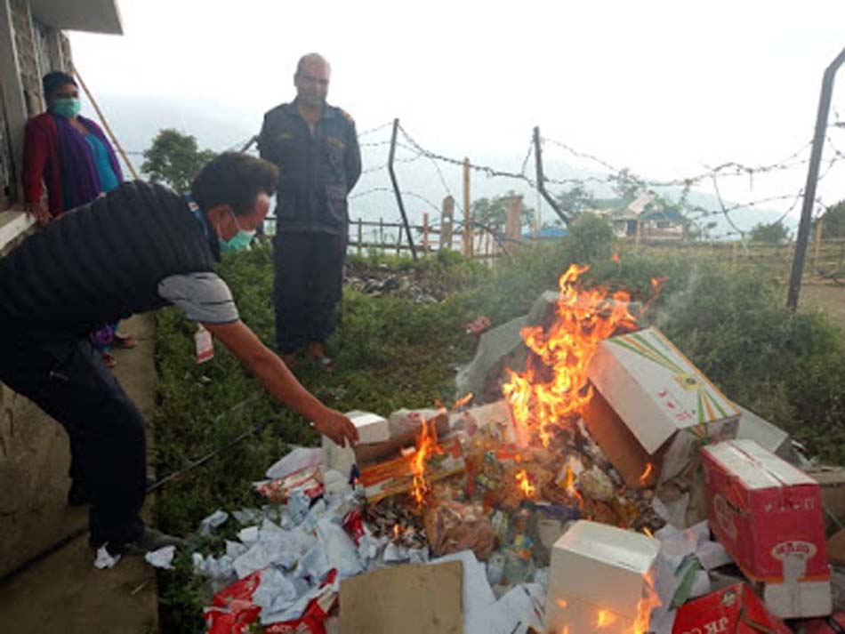 बरामद गरिएको अखाद्य वस्तु प्रमुख प्रशासकीय अधिकृत मगर, सामाजिक विकास अधिकृत दुर्गबहादुर राई, इलाका प्रहरी कार्यालय मात्तिमका प्रमुख शम्भुप्रसाद पौडेल, स्वास्थ्य शाखा संयोजक रिता ढकाल, उद्योग वाणिज्य सङ्घ शाखा कार्यालय साकेला गाउँपालिकाका अध्यक्ष चन्द्रबहादुर कटवाल लगायतको रोहबरमा जलाएर नष्ट गरिएको छ ।