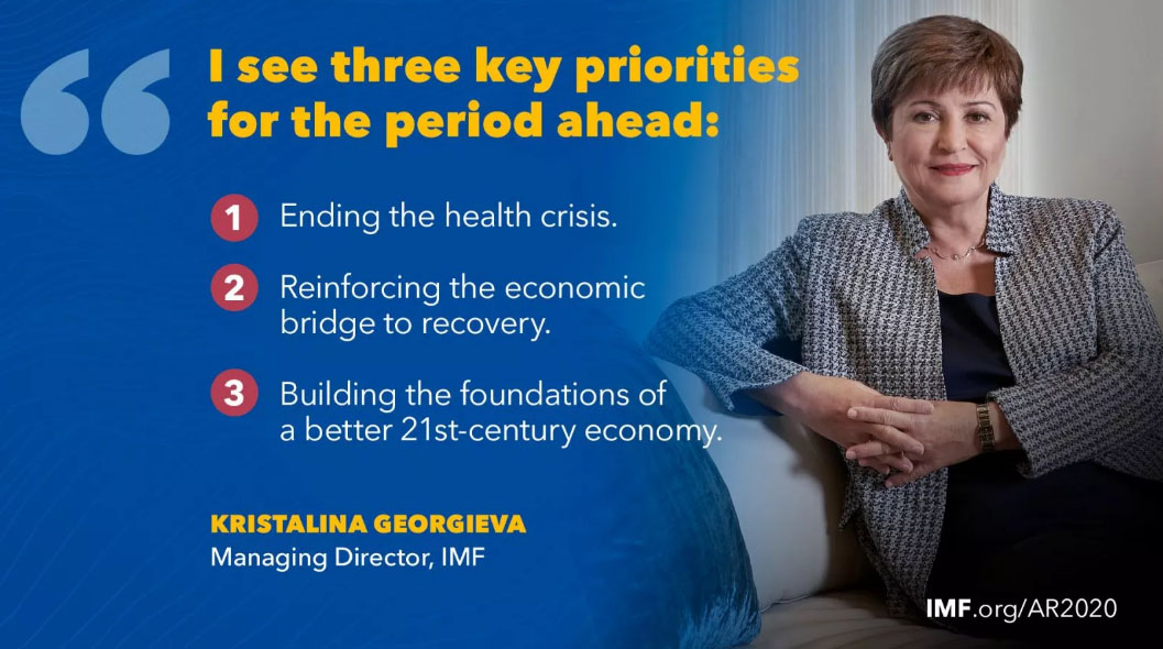 आइएमएफकी प्रबन्ध निर्देशक क्रिस्टालिना जर्जिवाले विश्वका २० प्रमुख अर्थव्यवस्था भएका मुलुकका नेताहरूसँग यसै साता हुन लागेको भर्चुअल बैठकका लागि आर्थिक सुधारमा गर्नुपर्ने कामका विषयमा बहसका लागि बुँदा तयार पारिएको बताएकी जनाईएको छ । जी – २० बैठकका लागि तयार पारिएको बहस नोटमा कोरोना भाइरसविरुद्ध खोप विकास भइरहेकाले त्यसबाट आशावादी हुनुपर्ने उल्लेख छ । (बिजमाण्डु डटकमबाट)