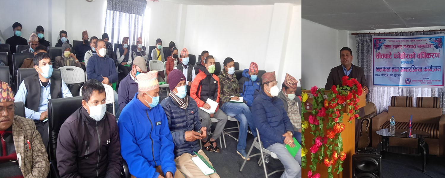 दिक्तेल, १९ मंसिर । दिक्तेल रुपाकोट मझुवागढी नगरपालिकाले स्रोतबाटै फोहोरको वर्गीकरण सम्बन्धि छलफल तथा अन्तरक्रिया कार्यक्रम गरेको छ । विभिन्न राजनीतिक दल, टोलबिकास समिति, उद्योग बाणिज्य संघ, होटल व्यवसायी, बिद्यालय, यातायात व्यवसायी लगायत समाजका अगुवा ब्यक्तिहरुको उपस्थितिमा शुत्रबार अन्तरक्रिया सम्पन्न भएको हो ।