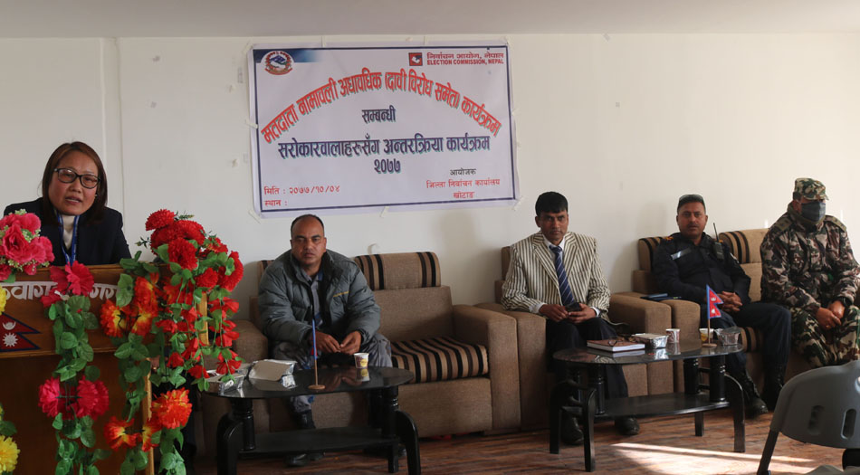 कार्यक्रममा जिल्लास्थित सुरक्षा निकायका प्रमुख, राजनीतिक दल, सरकारी तथा गैंरसरकारी कार्यालयका प्रमुखहरुको उपस्थिति रहेको थियो । दश स्थानीय तह रहेको जिल्लामा एक लाख ३३ हजार मतदाता रहेका छन् ।