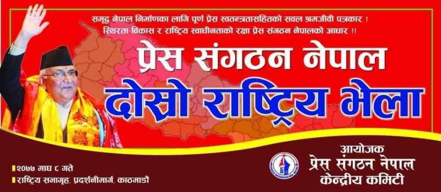 काठमाडौँ, ८ माघ । नेकपा ओली समूहका प्रेस सङ्गठन नेपालको दोस्रो राष्ट्रिय भेला आज काठमाडौंमा शुरु भएको छ । प्रदर्शनीमार्गस्थित राष्ट्रिय सभागृहमा हुने भेलालाई प्रधानमन्त्री केपी शर्मा ओलीसहित ६ जना मन्त्रीले सम्बोधन गर्ने कार्यक्रम छ ।