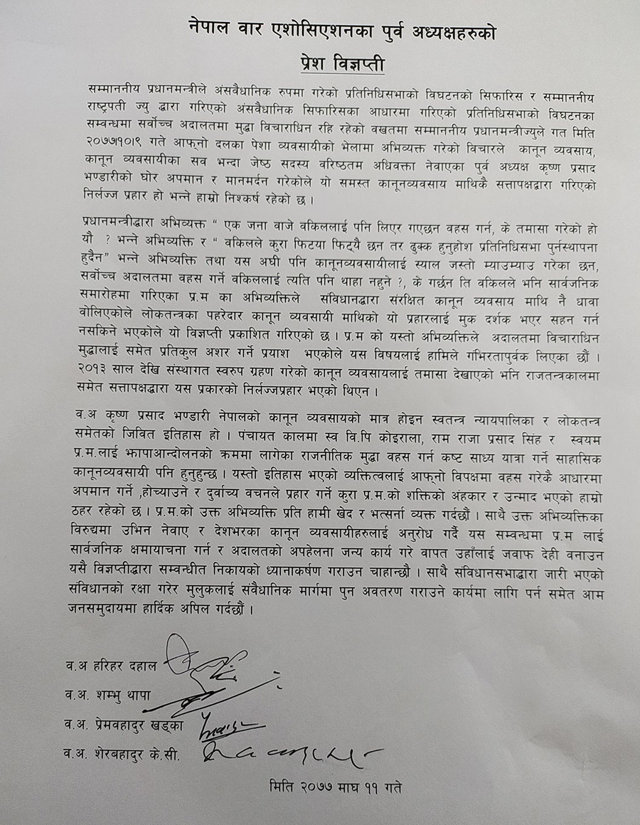 वरिष्ठ अधिवक्ताहरु हरिहर दाहाल, शम्भु थापा, प्रेमबहादुर खड्का र शेरबहादुर केसीको संयुक्त हस्ताक्षर रहेको विज्ञप्तिमा प्रधानमन्त्रीद्वारा अभिव्यक्त ‘एक जना बाजे वकिललाई पनि लिएर गएछन् बहस गर्नं, के तमासा गरेको हो यो ? भन्ने अभिव्यक्ति र ‘वकिलले कुरा फिटयाफिट्यै छन तर ढुक्क हुनुहोस प्रतिनिधि सभा पुनस्र्थापना हुँदैन’ भन्ने अभिव्यक्ति तथा यसअघि पनि कानून व्यवसायीलाई स्यालजस्तो म्याउम्याउ गरेको छन्, सर्वाेच्च अदालतमा बहस गर्ने वकिललाई त्यति पनि थाहा नहुने, के गर्छन ती वकिलले भनि सार्वजनिक समारोहमा गरिएका प्रमका अभिव्यक्तिले संविधानद्वारा संरक्षित कानून व्यवसायमाथि नै धावा बोलिएकोले लोकतन्त्रका पहरेदार कानून व्यवसायी माथिको यो प्रहारलाई मुकदर्शक भएर सहन गर्न नसकिने उल्लेख छ ।