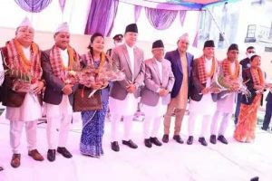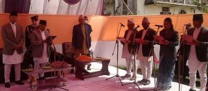 प्रदेश प्रमुख सोमनाथ अधिकारीबाट शपथ ग्रहण गर्नुहुँदै सामाजिक विकासमन्त्री उषाकला राई लगायत । तस्वीर सौजन्य : माननीय मन्त्री उषाकला राईको फेसबुक