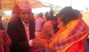 नेकपा एमाले खोटाङका अध्यक्ष रामप्रसाद दंगालबाट बधाई तथा शुभकामना ग्रहण गर्नुहुँदै सामाजिक विकासमन्त्री उषाकला राई । तस्वीर सौजन्य : माननीय मन्त्री उषाकला राईको फेसबुकबाट