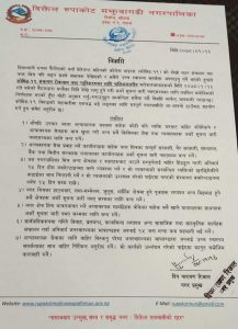 अत्यावश्यक सेवा प्रवाह गर्ने कार्यालयहरु बाहेक नगरभित्रका सम्पूर्ण सरकारी, गैर सरकारी, संस्थागत बैंक तथा वित्तीय संस्थाहरु बन्द गर्न, नगरपालिकाभित्र अन्य क्षेत्रहरु र शहरहरुबाट आउनेले १५ दिन अनिवार्य होम क्वारेन्टिन बस्नुपर्ने, उल्लंघन गरेमा नगरपालिकाको संस्थागत क्वारेन्टिनमा लगेर १५ दिन राखिने विज्ञप्तिमा उल्लेख छ।