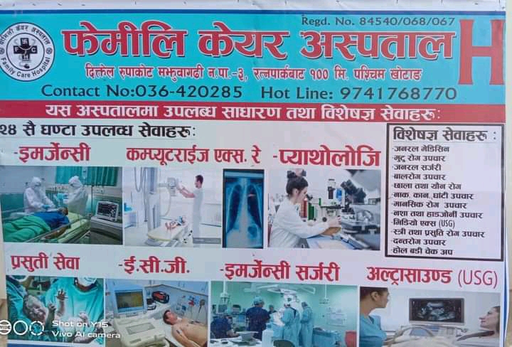 खोटाङ । खोटाङको दिक्तेल बजारमा हालै खुलेको फेमली कियर अस्पतालले अत्यनधुनिक उपकरणको प्रयोग सँगै आफ्नो सेवालाई व्यापक बनाएको छ । काठमान्डौँस्थित टिचिङ अस्पतालबाट आएका वरिष्ठ फेमली फिजिसियन डाक्टरद्धारा अस्पतालमा उपचार सेवा प्रदान गर्न थालिएको हो ।