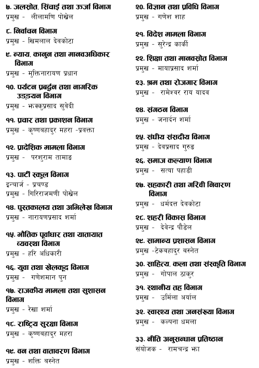 यस्तै माओवादीले केन्द्रीय विभाग पनि गठन गरेको छ । जसअनुसार अर्थ विभागको प्रमुखमा वर्षमान पुन रहेका छन् भने कृषि तथा भूमिसुधार विभागमा हरिबोल गजुरेल, उद्योग तथा बाणिज्य विभागमा वामदेव क्षेत्री, कृषि तथा आर्थिक व्यवस्थापन विभागमा डोरप्रसाद उपाध्याय, उपभोक्ता हित तथा आपूर्ति विभागमा मातृका यादव, खानेपानी तथा सरसफाइ विभागमा बिना मगर, प्रवक्तामा कृष्ण बहादुर महरा, संगठन विभागमा जनार्दन शर्मा प्रमुख रहेका छन् ।