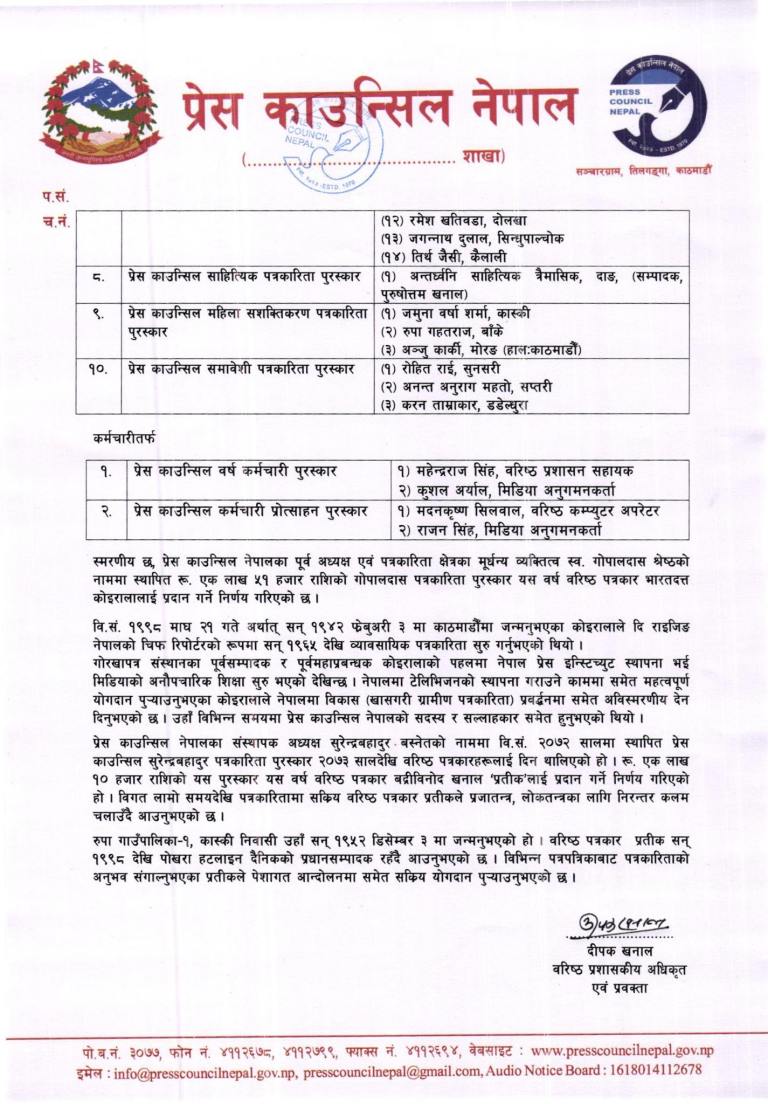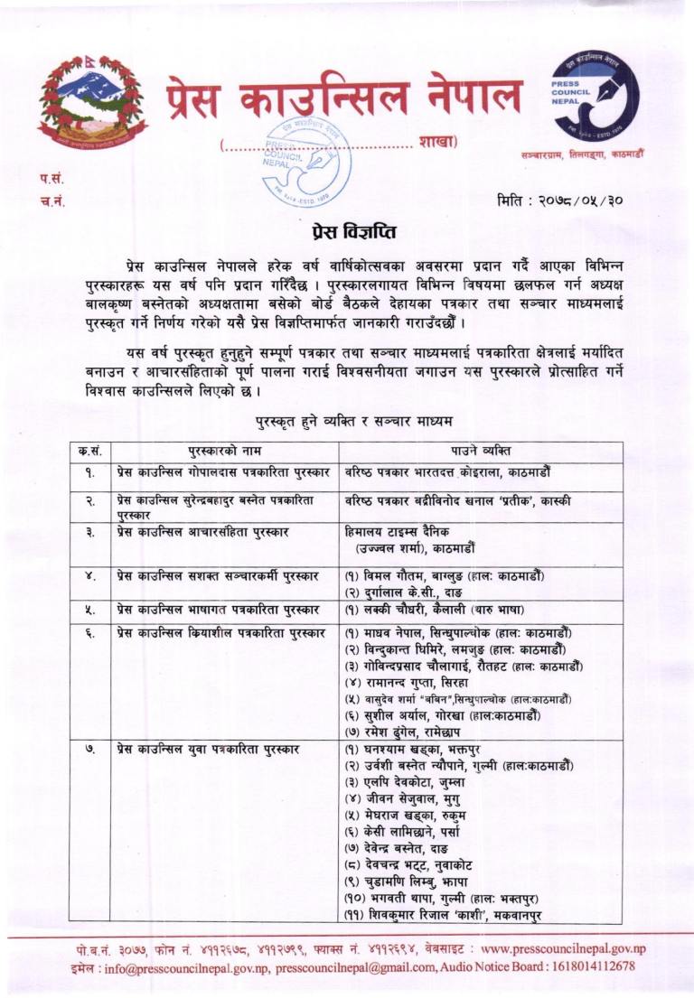 यसरी नै प्रेस काउन्सिल युवा पत्रकारिता पुरस्कार घनश्याम खड्का, उर्वशी बस्नेत, एलपी देवकोटा, जीवन सेजुवाल, मेघराज खड्का, केसी लामिछाने, देवेन्द्र बस्नेत, देवचन्द्र भट्ट, चूडामणि लिम्बू, भगवती थापा र शिवकुमार रिजालले पाउनुभएको छ । पुरस्कार यही ६ असोजमा काउन्सिल स्थापना दिवसको दिन वितरण गरिने काउन्सिलका प्रवक्ता खनालले जानकारी दिनुभयो ।