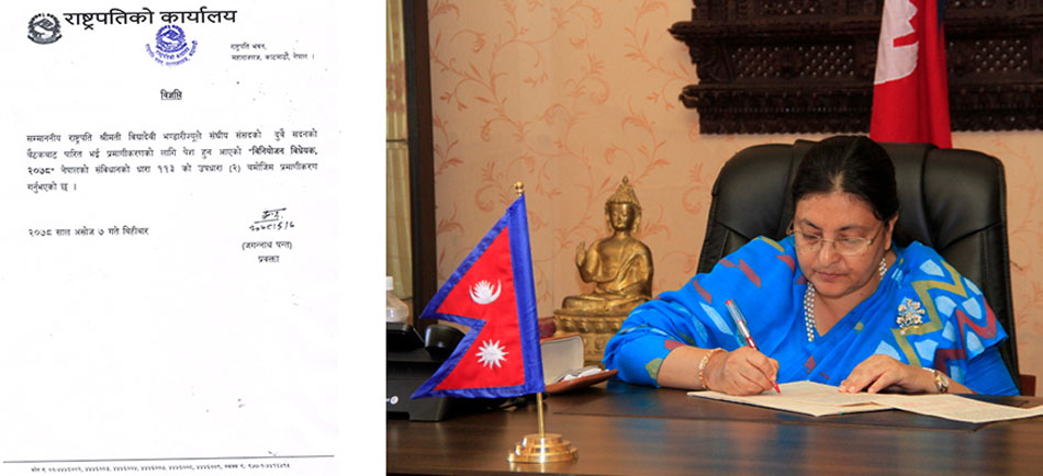 सो विधेयकलाई आज बसेको राष्ट्रियसभा बैठकले पारित गरेपछि र प्रतिनिधिसभा बैठकमा त्यहाँबाट प्राप्त पत्र प्रस्तुत गरिएको थियो । राष्ट्रियसभाबाट पारित भएर आएको विधेयकलाई प्रतिनिधिसभामा सभामुख अग्निप्रसाद सापकोटाले अब राष्ट्रपति कार्यालयमा प्रमाणीकरणका लागि पठाउनुभएको थियो ।