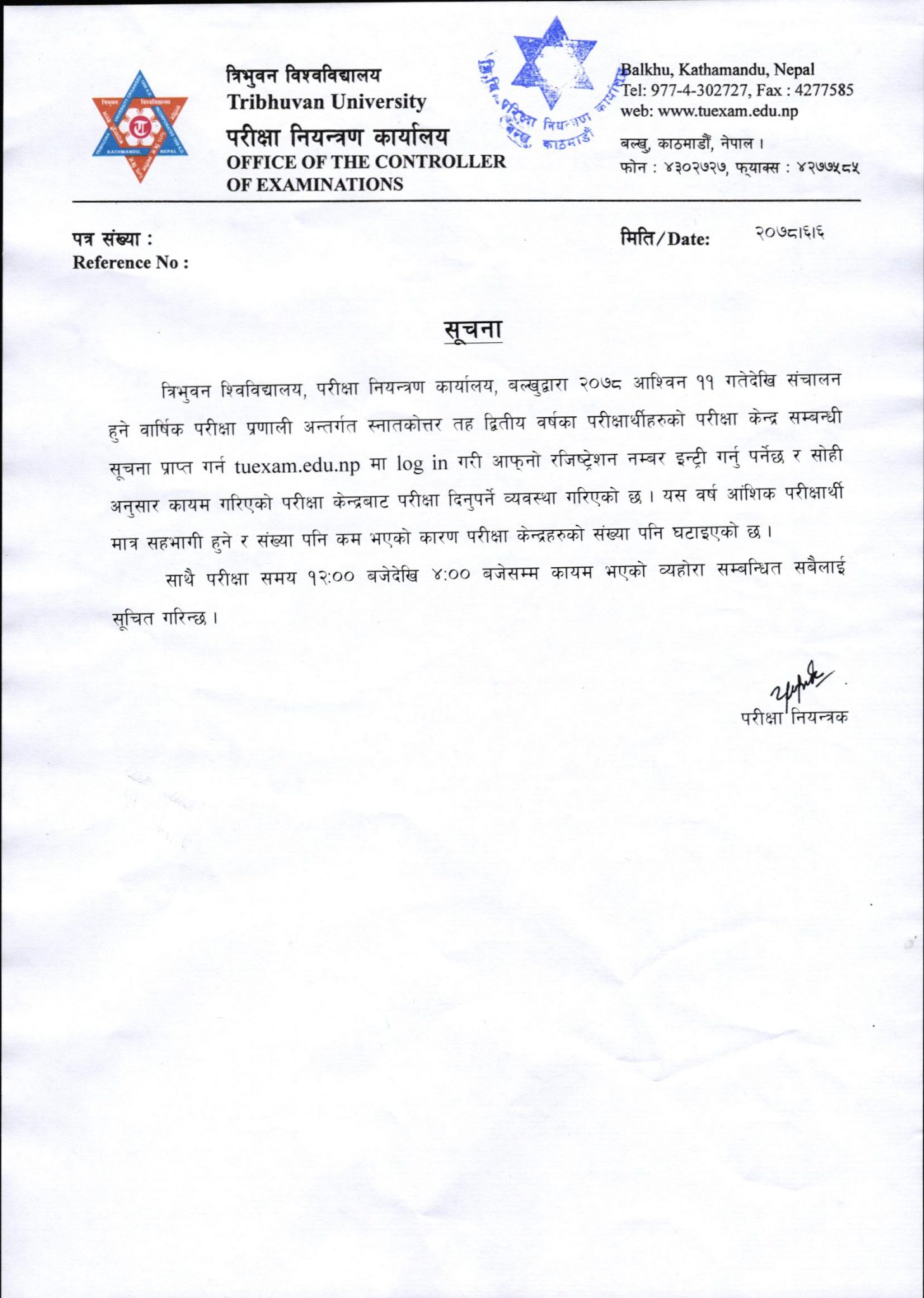 त्रिविले सूचना जारी गर्दै भनेको छ, ‘त्रिभुवन विश्वविद्यालय, परीक्षा नियन्त्रण कार्यालय, बल्खुद्धारा २०७८ आश्विन ११ गतेदेखि सञ्चालन हुने वार्षिक परीक्षा प्रणाली अन्तर्गत स्नातकोत्तर तह द्धितीय वर्षका परीक्षार्थीहरुको परीक्षा केन्द्र सम्बन्धी सूचना प्राप्त गर्न tuexam.edu.np मा लगइन गरी आफ्नो रजिष्ट्रेशन नम्बर इन्ट्री गर्नु पर्नेछ र सोही अनुसार कायम गरिएको परीक्षा केन्द्रबाट परीक्षा दिनुपर्ने व्यवस्था गरिएको छ ।