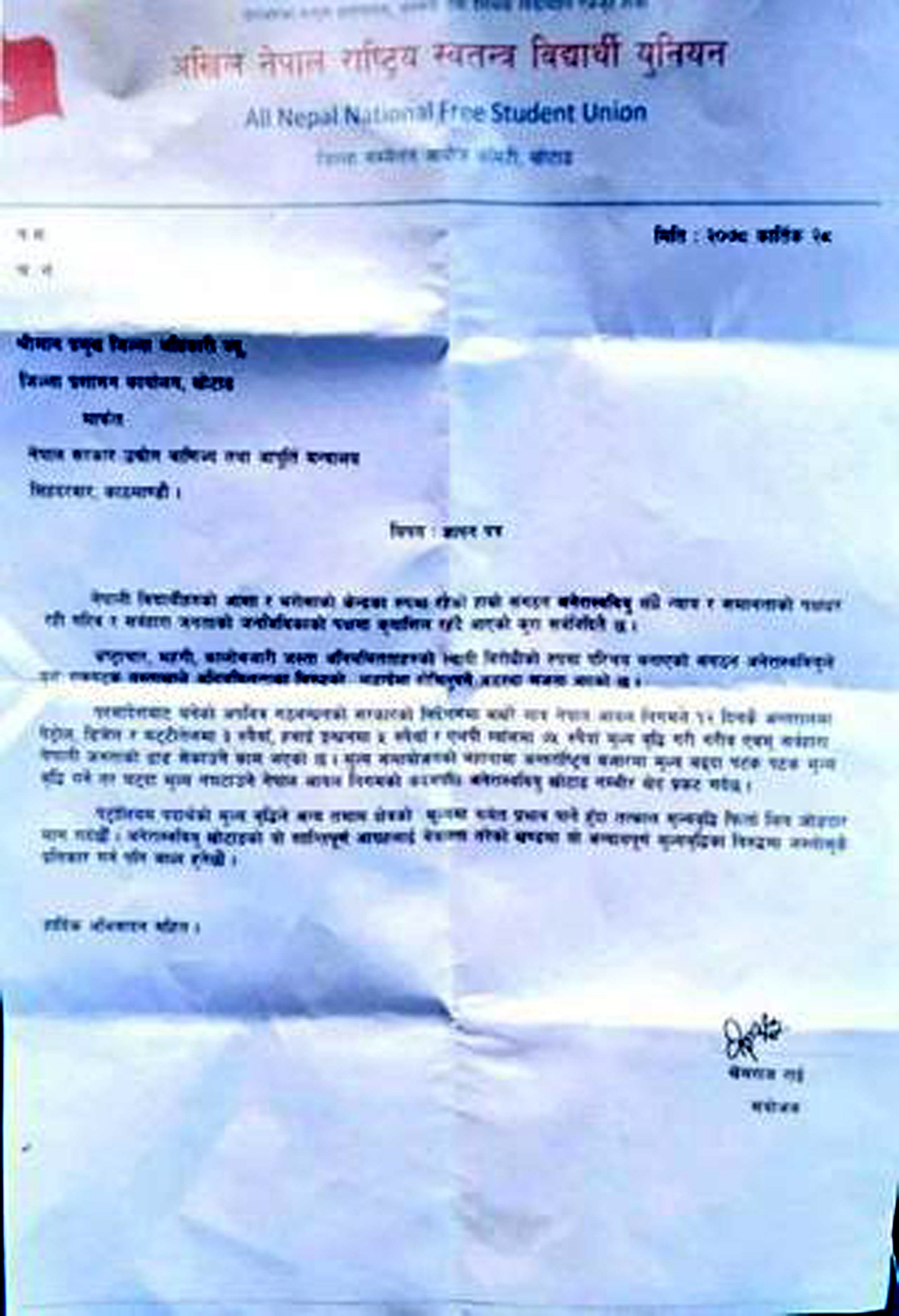 खोटाङ, २८ कातिक । नेपाल कम्युनिष्ट पार्टी (नेकपा) एमाले निकट अखिल नेपाल राष्ट्रिय स्वतन्त्र विद्यार्थी युनियन (अनेरास्ववियु) खोटाङले पेट्रोलियम पदार्थमा गरिएको मूल्य वृद्धि फिर्ता लिन माग गर्दै जिल्ला प्रशासनमार्फत नेपाल सरकार उद्योग वाणिज्य तथा आपूर्ति मन्त्रालयलाई ज्ञापन-पत्र बुझाएको छ । आइतबार खोटाङ जिल्लाका प्रमुख जिल्ला अधिकारी फडिन्द्र दाहललाई ज्ञापनपत्र बुझाएको हो ।