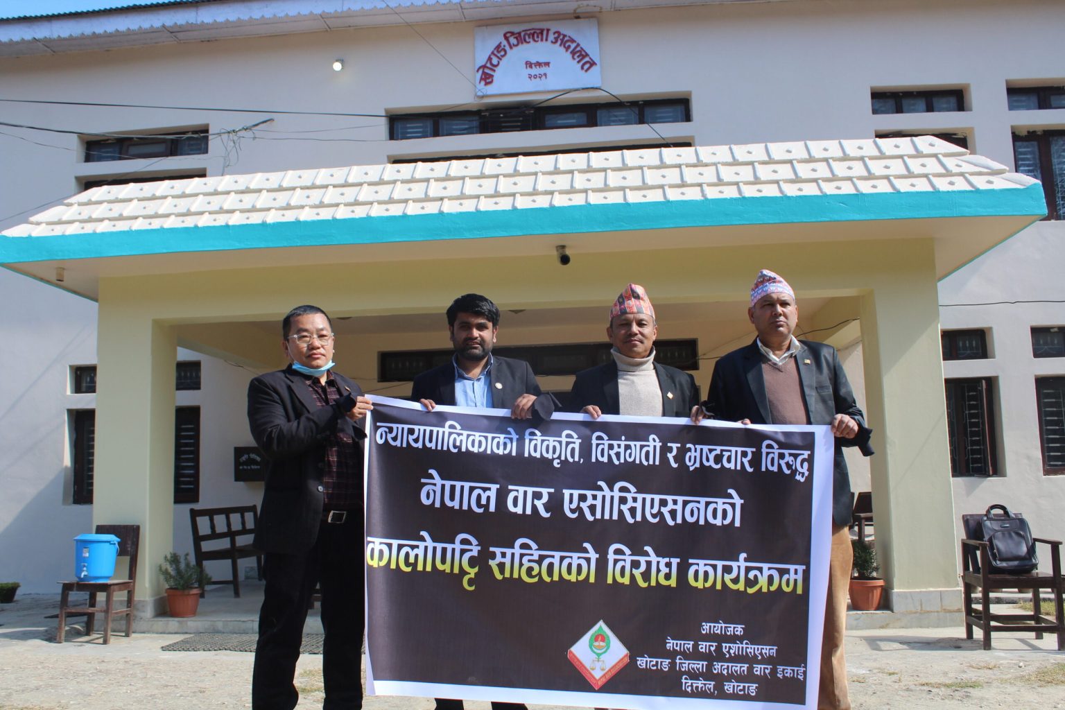 न्यायपालिकाको विकृति, विसंगती र भ्रष्टाचार विरुद्ध हातमा कालोपट्टि बाँधेर सोमबार बिहान ११ बजेदेखि मध्यान्ह १२ वजेसम्म विरोध जनाईएको अधिवक्ता ओमप्रकास घिमिरेले बताउनुभयो ।विकृति, विसंगती र भ्रष्टाचारमा चुर्लम्म डुबेको न्यायपालिकालाई शुद्धीकरण गर्नमा आफूहरुको विरोध कार्यक्रमले सहयोग पुग्ने घिमिरेले जानकारीदिनुभयो । ११ जना वारको जिल्ला सदस्य भए पनि उपलब्ध भएका कानुन व्यवसायीहरुले विरोध जनाएका हुन् ।