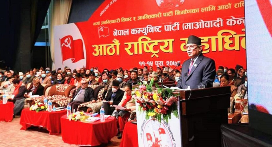 पार्टीको आठौँ राष्ट्रिय महाधिवेशनको बन्द सत्रमा आफ्नो प्रतिवेदन प्रस्तुत गर्दै प्रचण्डले दोस्रो संविधानसभा निर्वाचनसम्म आइपुग्दा टुटफुटले पार्टीमा क्षति भएको उल्लेख विस्तारै पार्टीलाई बलियो एकताको नीति लिइएको उल्लेख गर्नुभयो । जसअनुसार एमालेसँग पार्टी एकता गरेर नेकपा बनाइएपनि त्यो टिक्न नसकेको उहाँले उल्लेख गर्नुभएको छ ।