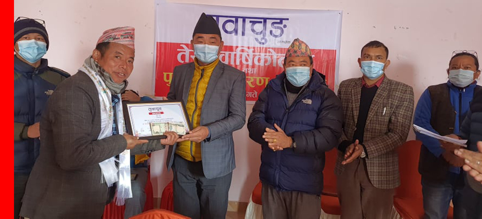 खोटाङ, ८ माघ । खोटाङबाट प्रकाशित तुवाचुङ साप्ताहिकले आफ्नो तेश्रो वार्षिकोत्सवको अवसरमा हलेसी खबर डटकमका सम्पादक हरिवोल आचार्यलाई पुरस्कृत गरेको छ । आफ्नो तेश्रो वार्षिकोत्सवको अवसर पारेर पत्रिकाले आचार्यलाई स्वर्गिय.इन्द्रसेर-गउनसरी राई-तुवाचुङ साप्ताहिक पुरस्कार प्रदान गरेको हो ।