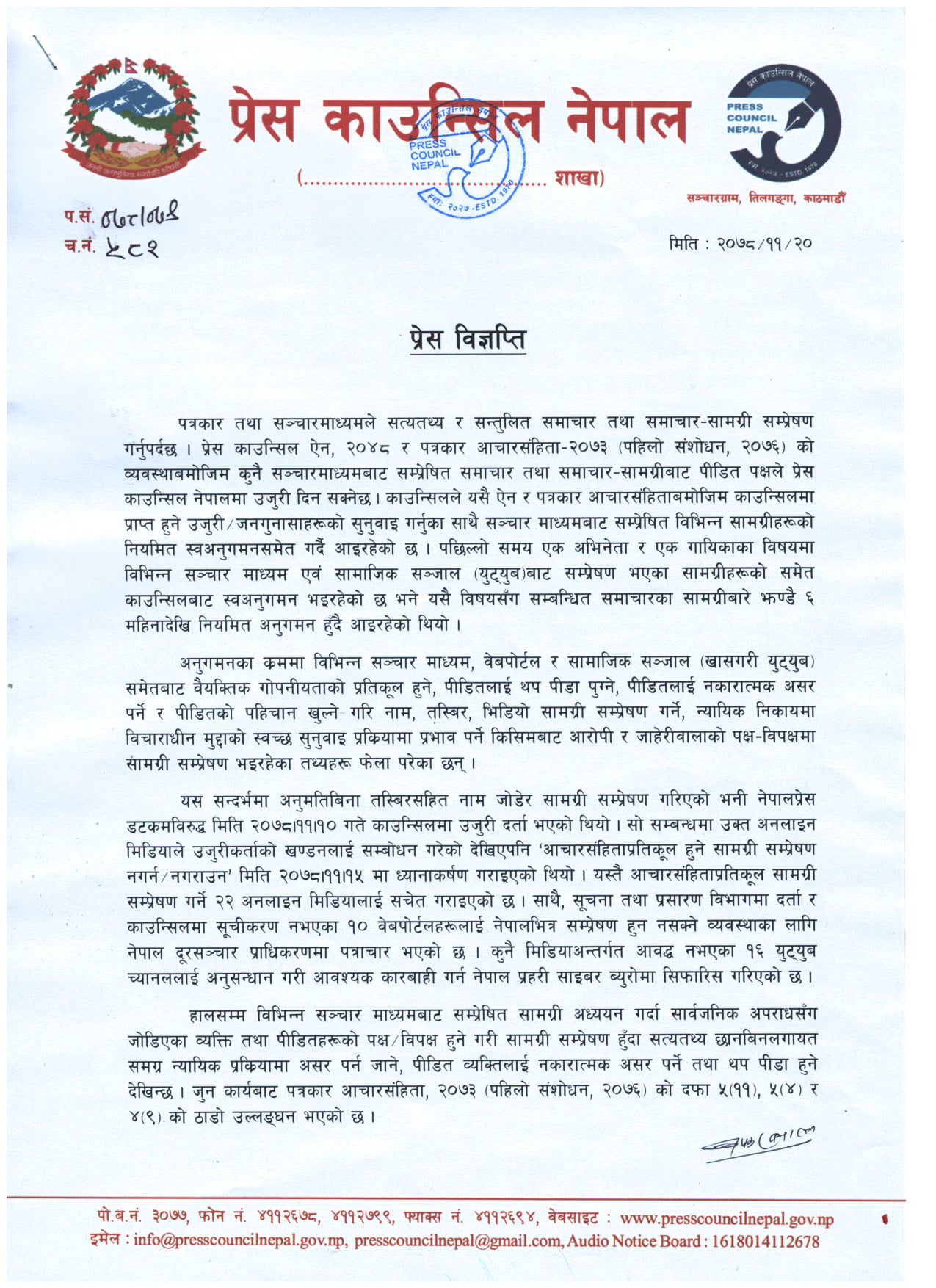 विभिन्न सञ्चार माध्यमबाट सम्प्रेषित सामग्री अध्ययन गर्दा सार्वजनिक अपराधसँग जोडिएका व्यक्ति तथा पीडितहरूको पक्ष-विपक्ष हुने गरी सामग्री सम्प्रेषण हुँदा पत्रकार आचारसंहिता, २०७३ (पहिलो संशोधन, २०७६) को दफा ५ (११), ५ (४) र ४ (९) को ठाडो उल्लंघन भएको वरिष्ठ प्रशासकीय अधिकृत दीपक खनालद्वारा जारी विज्ञप्तिमा उल्लेख गरिएको छ।