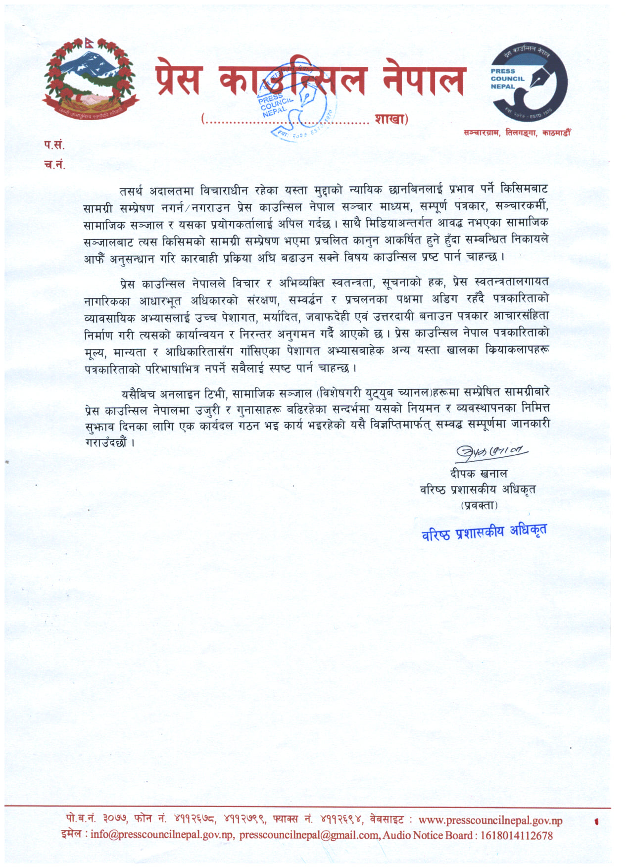 यसैबीच अनलाइन टिभी, सामाजिक सञ्जाल (विशेषगरी युट्युब च्यानल) हरूमा सम्प्रेषित सामग्रीबारे प्रेस काउन्सिल नेपालमा उजुरी र गुनासाहरू बढिरहेका सन्दर्भमा यसको नियमन र व्यवस्थापनका निमित्त सुझाव दिनका लागि एक कार्यदल गठन भइ कार्य भइरहेको विज्ञप्तिमार्फत् जनाइएको छ।