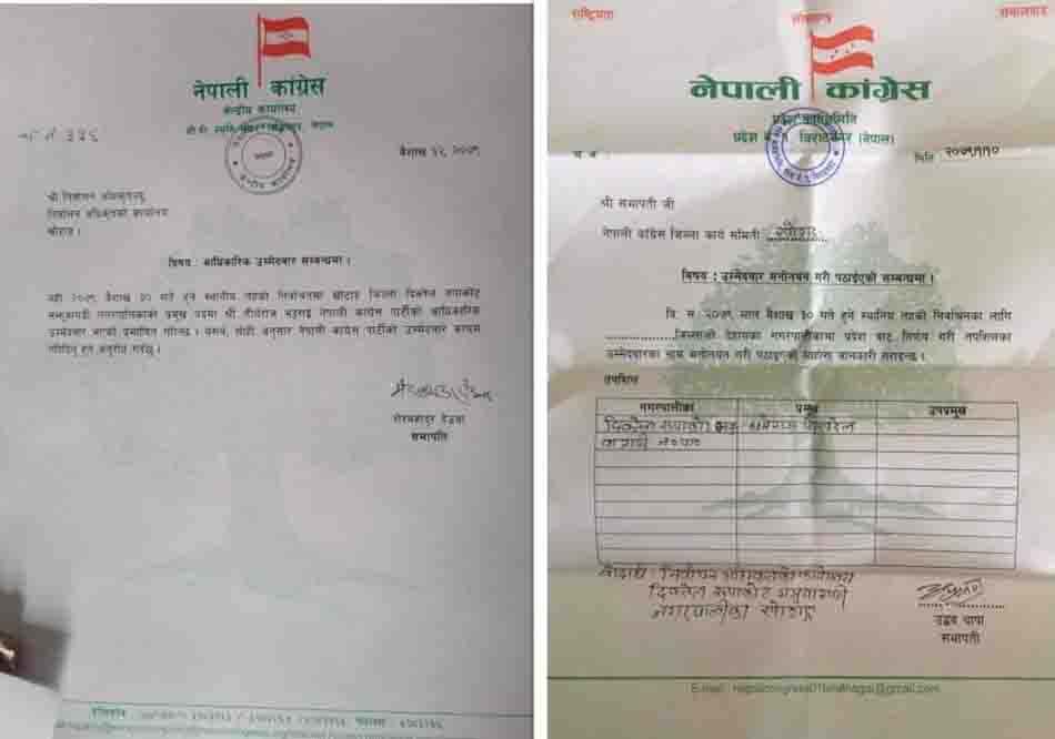 काँग्रेस प्रदेश समितिका सभापति उद्धव थापाको हस्ताक्षरमा पोखरेललाई उम्मेदवारका नाम मनोनयन गरिएको र केन्द्रीय सभापति शेरबहादुर देउवाको हस्ताक्षरमा भट्टराईलाई आधिकारिक उम्मेदवार भएको उल्लेख गरेर टिकट दिएको पाइएको छ । पोखरेललाई दिइएको टिकटमा चलानी नम्बर उल्लेख नगरी जिल्ला पार्टी सभापतिलाई सम्बोधन गरिएको छ भने भट्टराईलाई दिइएको टिकटमा चलानी नं. ३३६ उल्लेख गरेर निर्वाचन अधिकृतलाई सम्बोधन गरिएको छ ।