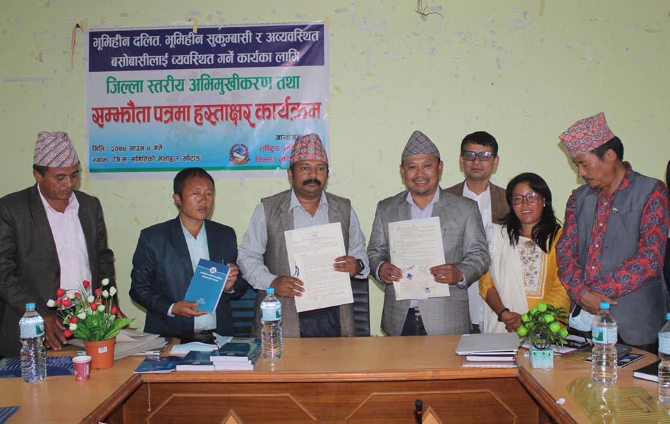 आयोगकातर्फबाट उपाध्यक्ष खड्का र स्थानीय तहकातर्फबाट प्रमुखहरुले सम्झौता–पत्रमा हस्ताक्षर गरेका छन् । आयोग र स्थानीय तहबीचमा सम्झौता भएसँगै ३५ दिने सूचना जारी हुने तथा भूमिहीन र अव्यवस्थित बसोबासीको आवेदन सङ्कलन गरेर जमिनको व्यवस्था मिलाइने आयोगका जिल्ला अध्यक्ष सुरेश राईले बताउनुभयो ।