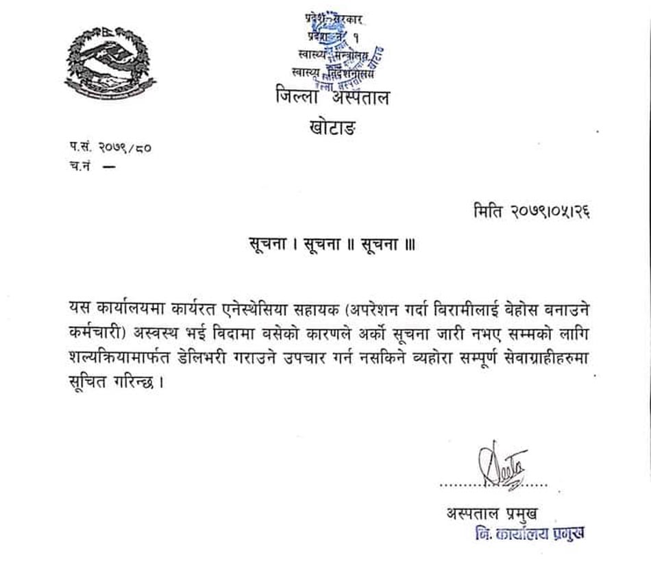 खोटाङ, २६ भदौ । जिल्ला अस्पताल खोटाङमा गर्भवतीलाई शल्यक्रियामार्फत प्रसुति गराउने सेवा अनिश्चितकालका लागि बन्द गरिएको छ । दिक्तेलस्थित जिल्ला अस्पतालमा कार्यरत एनेस्थेसिया (शल्यक्रिया गर्दा बिरामीलाई बेहोस बनाउने कर्मचारी) दुर्घटनामा खुट्टा भाँचिएर बिदामा बसेपछि गर्भवतीको शल्यक्रिया सेवा बन्द गरिएको अस्पतालले औपचारिक रुपमा सूचना प्रकाशन गरेर जानकारी दिएको हो ।
