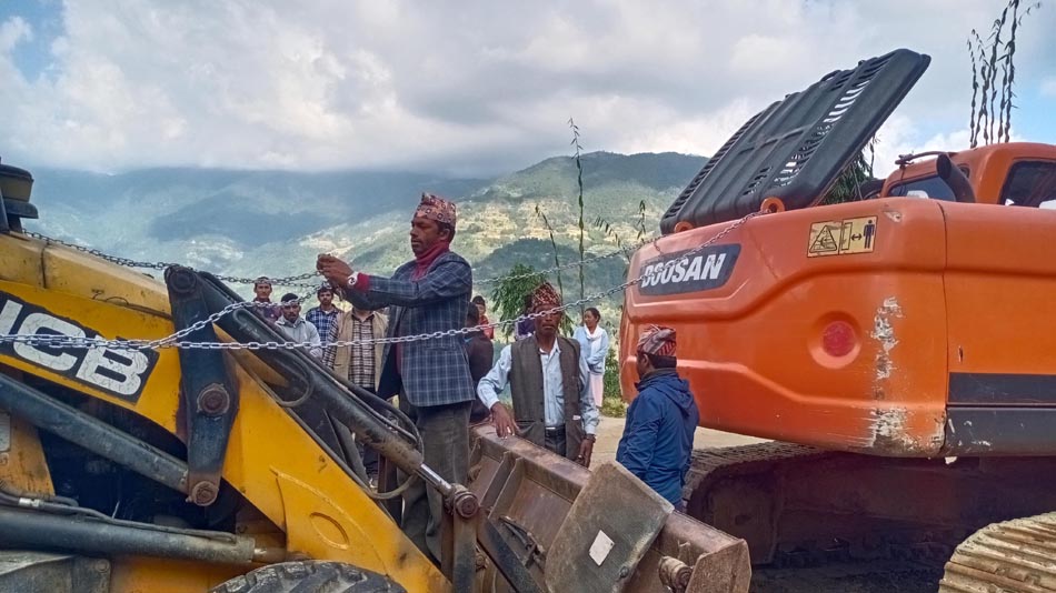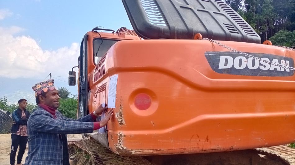 नगरपालिकाले नियन्त्रणमा लिएको स्काभेटर र ब्याकलोडरमा साङ्ली लगाएर चाबी हालिएको छ । नगरपालिकाका प्रवक्ता एवम् वडा नं–५ लफ्याङका वडाअध्यक्ष दिनेश घिमिरे र वडा नं १ का वडाअध्यक्ष नवराज राईले आइतबार स्काभेटर र ब्याकलोडरमा ताला लगाउनुभएको हो ।