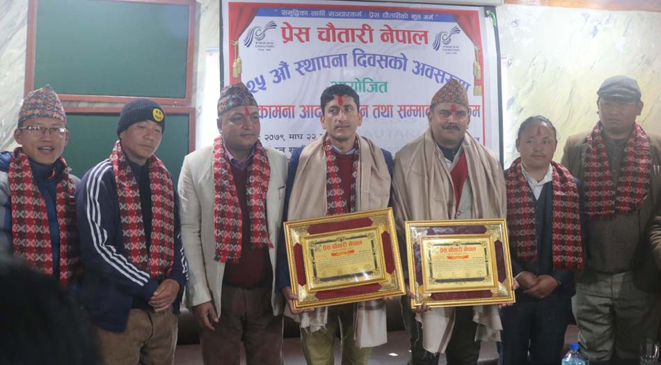 चौतारीले दिक्तेलस्थित होटल शुभदिनमा आयोजित कार्यक्रममा चौतारीका संस्थापन अध्यक्ष रमेश पौडेल र पूर्व अध्यक्ष हरिबोल आचार्यलाई सम्मानपत्रसहित दोसल्ला ओढाएर सम्मान गरेको छ । पत्रकारिता छाडेर राजनीतिमा लाग्नुभएका संस्थापन अध्यक्ष पौडेल अहिले नेकपा एमालेको केन्द्रीय सदस्य हुनुहुन्छ भने, अर्का सम्मानित पूर्व अध्यक्ष आचार्य प्रेस चौतारीको केन्द्रीय सदस्य तथा १ नं. प्रदेशका सह–इन्चार्ज हुनुहुन्छ ।