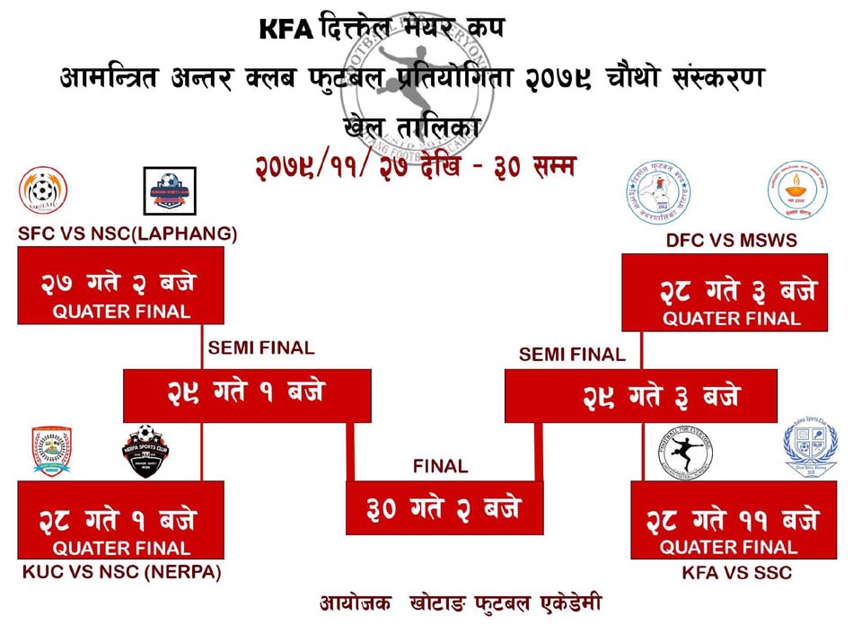 दिक्तेल मेयर कप फुटबलको चौथो सँस्करण अन्तरगत सञ्चालन हुन लागेको प्रतियोगिताको पहिलो खेल साकेला फुटबल क्लब रतन्छा र नमूना स्पोर्टस क्लब लफ्याङबीच प्रतिस्पर्धा हुने भएको छ । प्रतियोगिताको दोस्रो खेल आयोजक केएफए र सोल्मा स्पोर्टस क्लब सोल्माबीच प्रतिस्पर्धा हुने पत्रकार सम्मेलनमार्फत जनाइएको छ ।