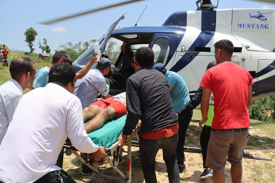 खोटाङ, १८ जेठ । विद्युत मर्मत गर्नेक्रममा पोलबाट लडेर गम्भीर घाइते हुनुभएका दिक्तेल रुपाकोट मझुवागढी नगरपालिका–४ खाल्लेका ३२ वर्षीय मिननाथ दाहालको हेलिकप्टरमार्फत उद्धार गरिएको छ । घर नजिकै काँडे भन्ने ठाउँमा नाङ्गो तार हटाएर एबिसी केबल लगाउनेक्रममा आज (बिहीबार) पोलबाट लडेर गम्भीर घाइते हुनुभएका दाहालको जिल्ला अस्पताल दिक्तेलमा उपचार सम्भव नभएपछि रु दुई लाख ४० हजारमा चार्टर गरिएको हेलिकोप्टरमार्फत गरेर काठमाडौँ लगिएको हो ।