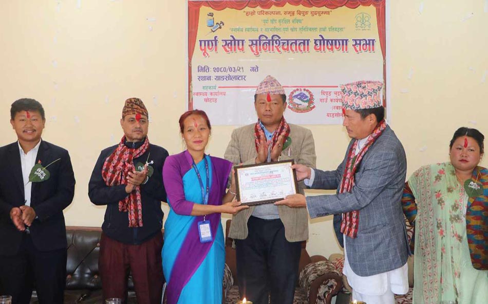 पूर्ण खोप सुनिश्चितता घोषणासभामा स्वास्थ्यकर्मी र महिला स्वास्थ्य स्वम्सेविकालाई सम्मान गरिएको जनाइएको छ । दश स्थानीय तह रहेको खोटाङ जिल्लाका अन्य स्थानीय तहले यसअघि नै आ–आफ्नो पालिकालाई पूर्ण खोप सुनिश्चितता पालिका घोषणा गरिसकेका छन् ।