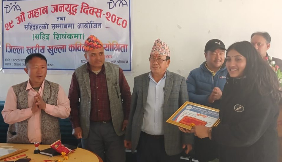 खोटाङ, १ फागुन । दिक्तेलमा सम्पन्न खुला कविता प्रतियोगितामा ऐसेलुखर्क गाउँपालिका–६ ज्यामिरेकी सुशिला तिम्सिना प्रथम हुनुभएको छ । २९ औँ जनयुद्ध दिवसको अवसर पारेर ‘दिलकाजी–ठूलकुमार स्मृति प्रतिष्ठान’ खोटाङले मङ्गलबार दिक्तेलमा आयोजना गरेको ‘शहीद शीर्षक’को खुला कविता प्रतियोगितामा १४ जना प्रतियोगीलाई पछि पार्दै तिम्सिनाले प्रथम उपाधि जित्नुभएको हो ।