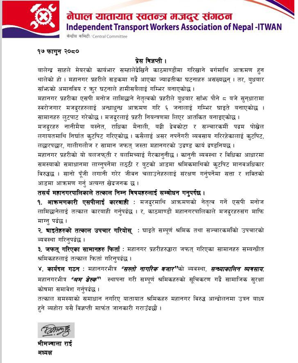 धरान, १७ फागुन । बुधबार साँझ काठमाडौँको सुन्धारामा स्वरोजगार मजदुरमाथि आक्रमणको नेतृत्व गर्ने काठमाडौँ महानगरपालिकाका महानगर प्रहरीका एसपी मनोज लामिछानेलाई तत्काल कारबाही गर्न नेपाल यातायात स्वतन्त्र मजदुर संगठनले माग गरेको छ । सङ्गठनका केन्द्रीय अध्यक्ष भीमज्वाला राईले बिहीबार विज्ञप्ति जारी गर्दै एसपी लामिछानेलाई कारबाही गर्दै सम्पूर्ण मजदुरहरुसँग काठमाडौँ महानगरपालिकाले माफि माग्नु पर्ने माग गर्नुभएको छ ।
