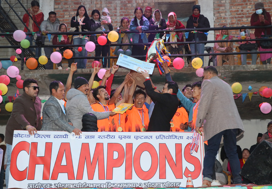 खोटाङ, २० फागुन । सोल्मा स्पोर्टस् क्लब सोल्मा खोटाङले आयोजना गरेको ‘अण्डर–२३ वडास्तरीय पुरुष फुटबल प्रतियोगिता–२०८०’को उपाधि साकेला गाउँपालिका–५ मात्तिमले जितेको छ । दिक्तेल रुपाकोट मझुवागढी नगरपालिका–२ सोल्मास्थित सोल्मा स्पोर्टस् क्लबको आफ्नै खेलमैदानमा आइतबार साँझ सम्पन्न फाइनल खेलमा खोटेहाङ गाउँपालिका–३ सावाकटहरेलाई ट्राइब्रेकरमा ६–५ गोल अन्तरले पछि पार्दै मात्तिमले रु एक लाख २२ हजार २२२ पुरस्कार राशीको उपाधि जितेको हो ।