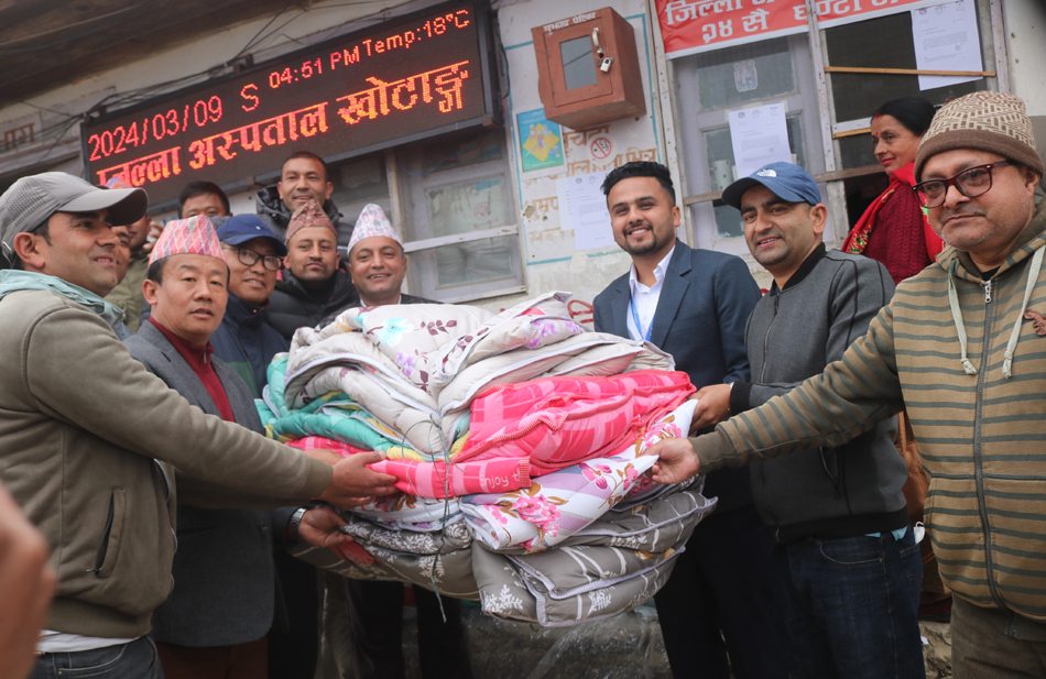 युवाले आर्थिक सङ्कलन गरेर जुटाएको सिरक, सिरकको खोल, बेड कभर र सिरानी आइतबार प्रदेशसभा सदस्य भूपेन्द्र राई, नेपाल कम्युनिष्ट पार्टी (एमाले) खोटाङका अध्यक्ष रामप्रसाद दंगाल, दिक्तेल रुपाकोट मझुवागढी नगरपालिका–१ दिक्तेलका वडाध्यक्ष नवराज राई, वडा नं. ९ निर्मलीडाँडाका वडाध्यक्ष दिनेश कठेत लगायतले संयुक्तरुपमा अस्पतालका प्रमुख डा. रुपेश सङ्ग्रौलालाई हस्तान्तरण गर्नुभएको छ । जिल्ला अस्पतालमा भर्ना भएका बिरामीले ओढ्ने ओछ्याउनेगरी सिरक, सिरकको खोल, बेड कभर र सिरानी प्रदान गरिएको सहयोगीहरुले बताएका छन् ।