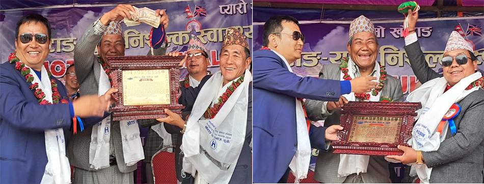 खोटाङ, २४ चैत । खोटाङ सेवा समाज बेलायत (युके)ले शिक्षाविद् चतुरभक्त राईलाई ‘खोटाङ नागरिक सम्मान–२०८०’ र कवि चन्द्र रानोहँछालाई ‘खोटाङ प्रतिभा पुरस्कार–२०८०’ प्रदान गरेको छ । बेलायतमा बसोबास गर्दै आएका खोटाङ्गेहरुले सन् २००७ मा स्थापना गरेको संस्थाले शनिबार दिक्तेलस्थित शुभम् फाउण्डेशनमा आयोजित कार्यक्रममा शिक्षाविद् चतुरभक्तलाई रु एक लाख राशिको खोटाङ नागरिक सम्मान र कवि रानोहँछालाई रु ५० हजार राशिको खोटाङ प्रतिभा पुरस्कार प्रदान गरेको हो ।