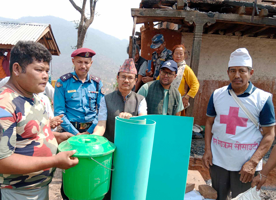 गोठ जलेका योगबहादुर मगरलाई नगर र वडा कार्यालयले एक÷एक थान त्रिपाल वितरण गरेको छ । डढेलो पीडितलाई नगर प्रमुख विमला राई र वडाध्यक्ष काशीराज राईले राहत हस्तान्तरण गर्नुभएको हो ।