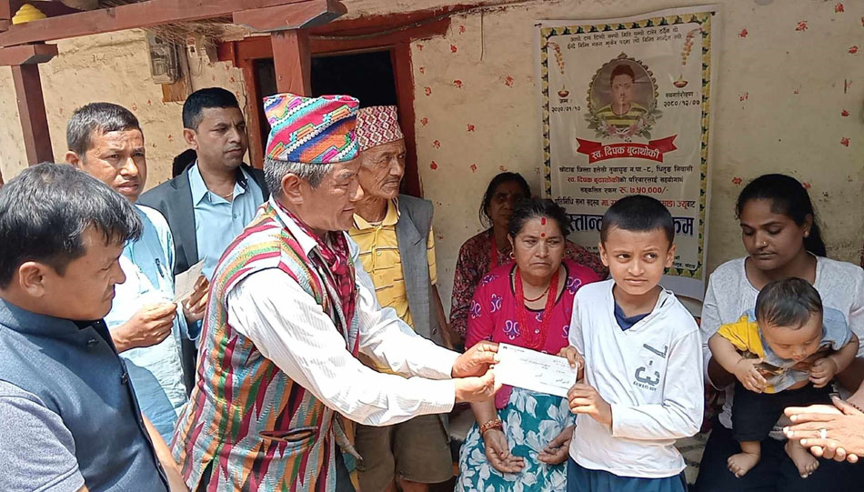 खोटाङ, २१ जेठ । वैदेशिक रोजगारीको सिलसिलामा दुबईमा ज्यान गुमाएका हलेसी तुवाचुङ नगरपालिका–८ धितुङका ३० वर्षीय दीपक बुढाथोकीको परिवारलाई आर्थिक सहयोग उपलब्ध गराइएको छ । वि.सं. २०८० चैत–७ गते दुबईमा भएको सडक दुर्घटनामा ज्यान गुमाएका दीपकको परिवारलाई सोमबार रु सात लाख ५० हजार आर्थिक सहयोग रकम उपलब्ध गराइएको हो ।