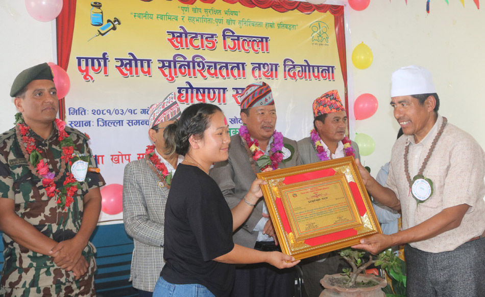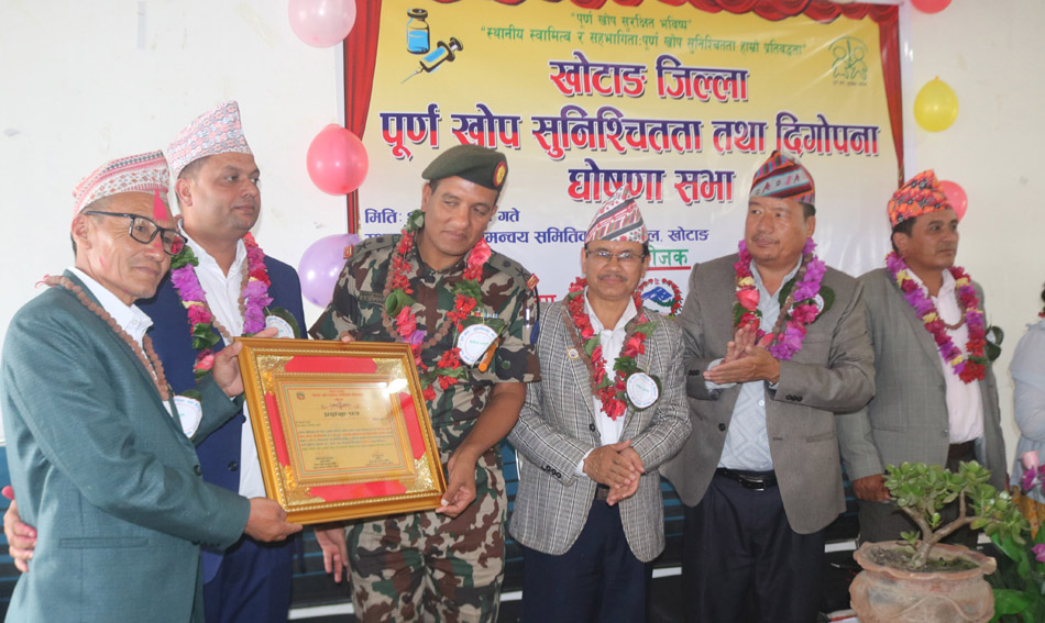 खोटाङ, १८ असार । खोटाङ जिल्लालाई पूर्ण खोप सुनिश्चितता तथा दिगोपना जिल्ला घोषणा गरिएको छ । जिल्लाका दशवटै स्थानीय तहले पूर्ण खोप सुनिश्चितता तथा दिगोपना घोषणा गरेपछि मङ्गलबार जिल्लालाई औपचारिक रुपमा पूर्ण खोप सुनिश्चितता तथा दिगोपना जिल्ला घोषणा गरिएको हो ।