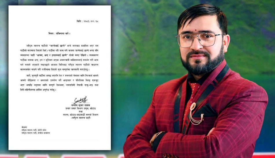 राजिनामा पत्रमा भनिएको छ, “राष्ट्रिय स्वतन्त्र पार्टीको “जान्नेलाई छान्ने” भन्ने नाराबाट प्रभावित भएर यस पार्टीको सदस्यता लिएको थिएँ । पार्टीमा रही काम गर्ने क्रममा जान्नेलाई छान्ने भन्दा पनि व्यवहारमा चाहीँ “आफ्ना, भ्रष्ट र ठगहरुलाई छान्ने” रहेकोे स्पष्ट देखियो । त्यसकारण पार्टीका नाममा भ्रष्ट, ठग र कुनियत भएका अवसरवादी व्यक्तिहरुलाई समर्थन गरी काम गर्न नसक्ने भएकाले स्वइच्छाले आजका मितिबाट राष्ट्रिय स्वतन्त्र पार्टीको साधारण सदस्यसमेत नरहने गरी राजीनामा दिएको कुरा सम्पूर्णमा जानकारी गराउँदछु । जुनसुकै पार्टीमा आवद्ध भएपनि देश र जनताको सेवाका लागि निश्वार्थ भावले आफ्नो बौद्धिकता र क्षमताको उपयोग गर्दै भ्रष्टाचार र वेथितिका विरुद्ध एकजुट भएर अगाडि बढ्नका लागि सम्पूर्ण देशभक्त, जनताप्रेमी नेपाली दाजु–भाइ तथा दिदी–बहिनीहरुमा हार्दिक अनुरोध गर्दछु ।”