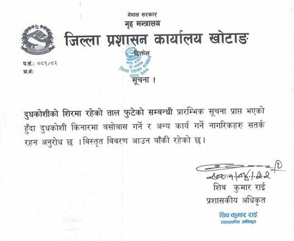 “दूधकोशीको शीरमा रहेको ताल फुटेको भन्ने प्रारम्भिक सूचना प्राप्त भएको छ”, जिल्ला प्रशासन कार्यालय खोटाङका प्रशासकीय अधिकृत शिवकुमार राईले शुक्रबार साँझ जारी गर्नुभएको सूचनामा भनिएको छ, “दूधकोशी किनारमा बसोबास गर्ने र अन्य कार्य गर्ने नागरिकहरु सतर्क रहन अनुरोध छ”