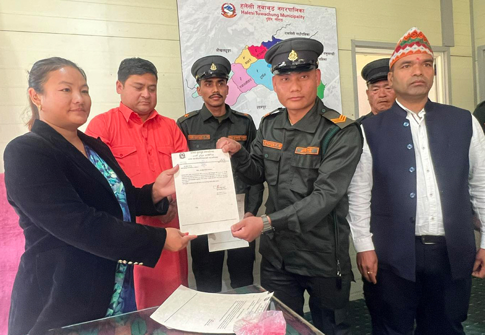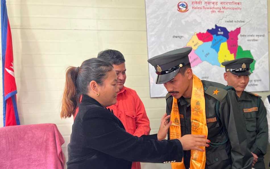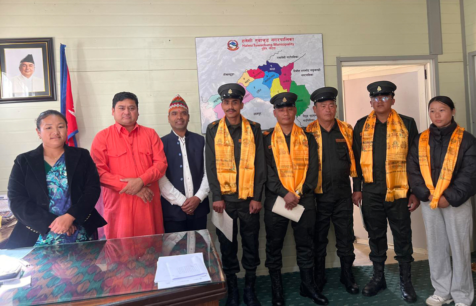 खोटाङ, ३० कात्तिक । हलेसी तुवाचङ नगरपालिकाले प्रहरी सहायक निरीक्षकको नेतृत्वमा पाँचजना नगर प्रहरी नियुक्त गरेको छ । नेपालको संविधान २०७२ को धारा ५७ को (४) र २२६ तथा स्थानीय सरकार सञ्चालन ऐन, २०७४ को दफा १०२ को (१) बमोजिम नगरपालिकाले आज (शुक्रबार) दर्जानी चिन्हसहित प्रहरी सहायक निरीक्षकको नेतृत्वमा पाँचजना नगर प्रहरी नियुक्त गरेको हो ।