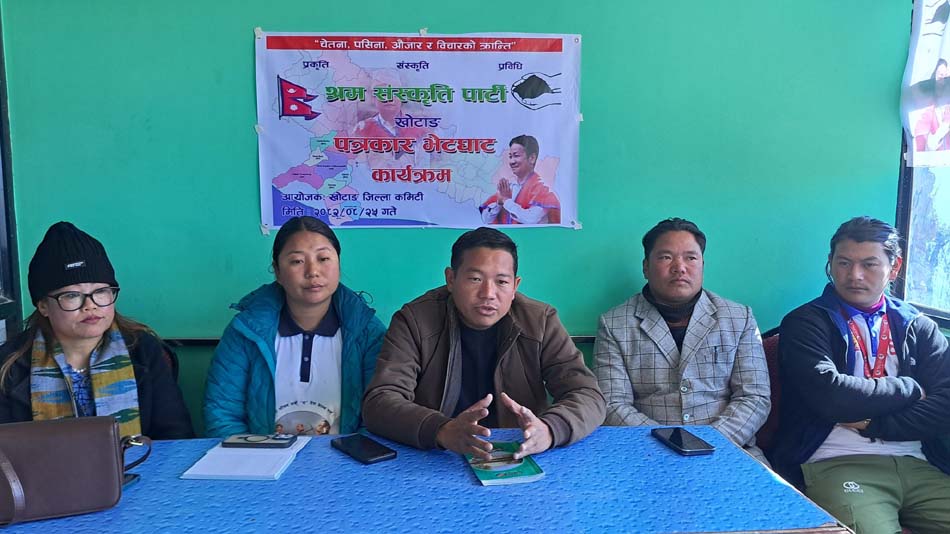 दिक्तेलस्थित ईन्द्रेणी होटलमा आज (बिहीबार) आयोजना गरिएको पत्रकार सम्मेलनमा जिल्ला सहसंयोजक उमा चाम्लिङ, जिल्ला सदस्यहरु सँगीता राई, धनीराम नछुङ र प्रशान्त राईको उपस्थिति रहेको थियो । श्रम संस्कृति पार्टी खोटाङले मङ्सिर–२७ गतेको आमसभालाई सफल बनाउन जिल्लाका विभिन्न ठाउँमा पुगेर प्रचार–प्रसारलाई तीव्रता दिएको छ ।
